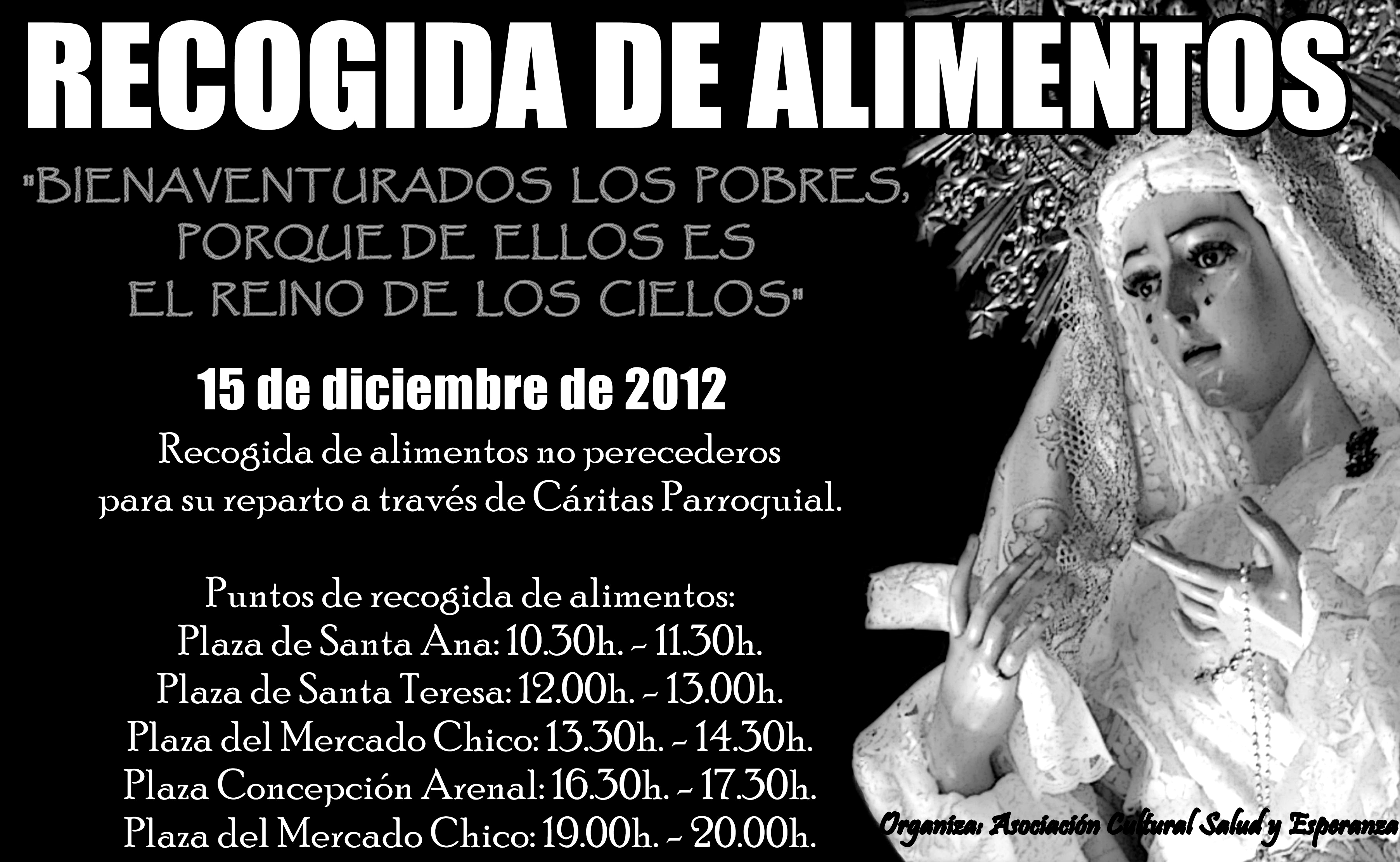 Las actividades caritativas se extienden adems a la Asociacin Cultural Salud y Esperanza de vila, que ha organizado una caravana solidaria de Recogida de Alimentos por el centro de vila el da 15 de diciembre de 2012. Los alimentos recaudados se unirn a los ya obtenidos por los medios anteriores, y se destinarn a los mismos fines. Este es el horario e itinerario de la caravana de recogida de alimentos que organiza esta Asociacin Cultural: