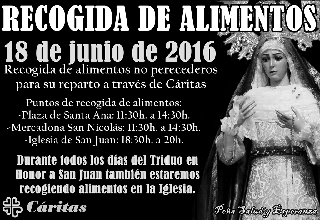 El prximo sbado, 18 de junio, nuestra Misa de Hermandad mensual se celebrar a las 20.00 h. en la Parroquia de San Juan Bautista. Adems, como es habitual cada ao con la llegada de las fiestas de San Juan, la Asociacin Cultural Salud y Esperanza organiza su recogida de alimentos en favor de Critas que tambin tendr lugar dicho da 18, aunque podrn tambin entregarse alimentos no perecederos durante todos los das del Triduo a San Juan en la Iglesia. En el cartel pueden ver el horario y puntos de recogida de alimentos.