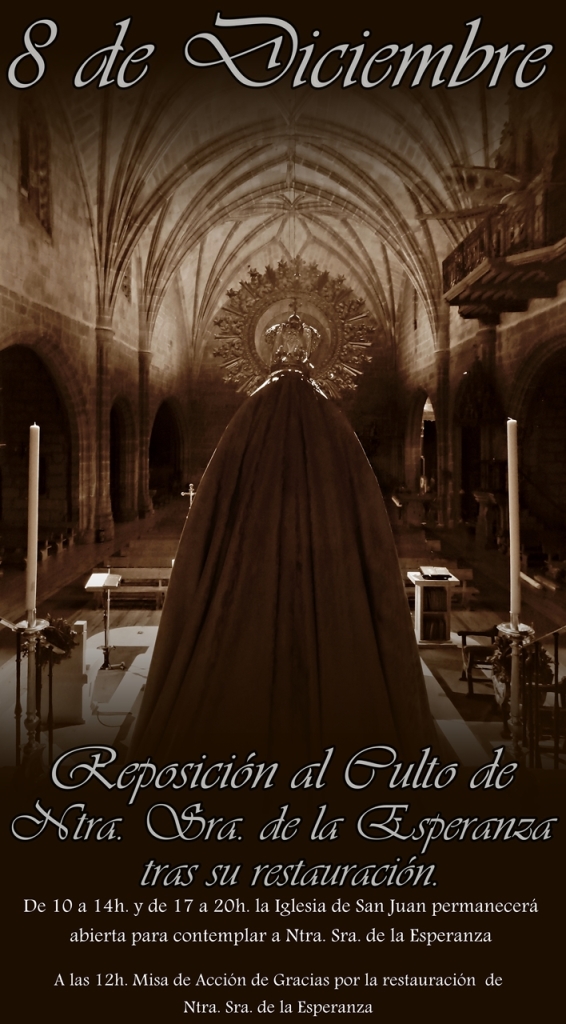Para recibir a Ntra. Sra. de la Esperanza la Hermandad celebrar Santa Misa de Accin de gracias por la finalizacin de la restauracin a las 12.00 h. del 8 de diciembre en la Parroquia de San Juan Bautista. No obstante, la Iglesia permanecer abierta en horario de 10.00 a 14.00 h. y de 17.00 a 20.00 h. para que todos los hermanos y devotos puedan acercarse a dar la bienvenida a Ntra. Sra. de la Esperanza y contemplar el resultado de la restauracin.
