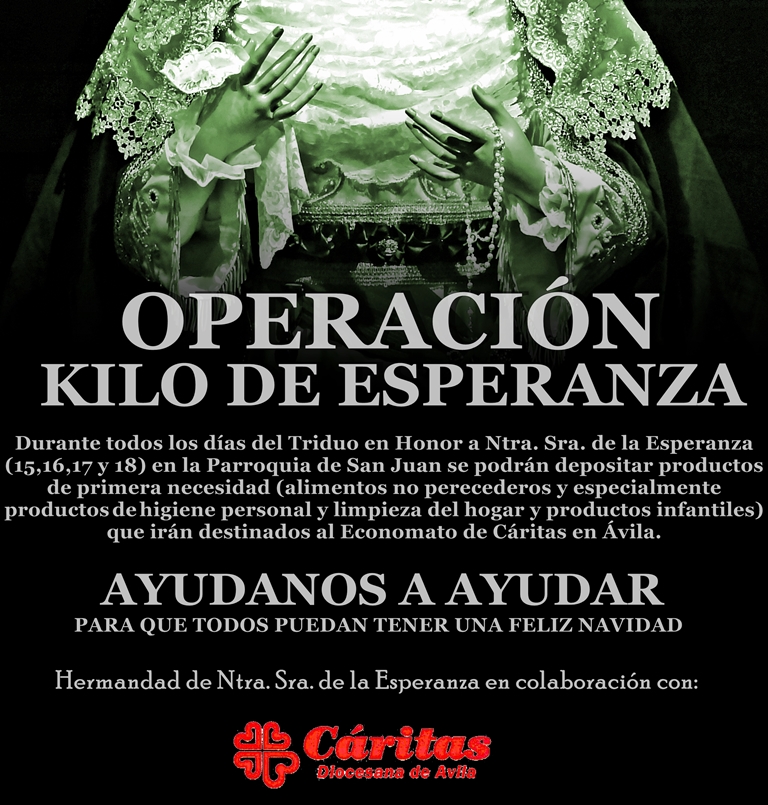 Durante los Cultos en honor de Ntra. Sra. de la Esperanza, en San Juan, los das 15 a 18 de diciembre, se podrn depositar alimentos no perecederos en la Capilla de la Hermandad, que posteriormente sern entregados a Caritas Diocesana para su distribucin entre las familias ms necesitadas a travs de su Economato. Desde Caritas se nos piden tambin artculos de desayuno, productos infantiles, de higiene personal y de limpieza del hogar. Rogamos colaboracin para que todo el mundo pueda tener una Feliz Navidad. Los das 15 a 17 se podrn depositar los productos en la Capilla entre las 19.30 h. y las 21.00 h. y el da 18 entre las 11.30 y las 13.30 h. aproximadamente.