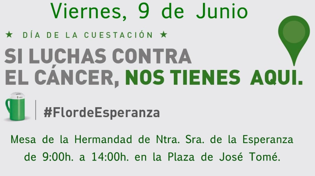 El prximo viernes, 9 de junio, entre las 10.00 y las 14.00 h., nuestra Hermandad volver un ao ms a colaborar con la Asociacin Espaola contra el Cncer en su cuestacin anual colocando una mesa recaudatoria en la Plaza de Jos Tom, a la que animamos a todos los hermanos a acudir para colaborar con los importantes fines de esta Asociacin.